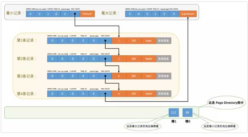? 规定 最小记录 的下一条记录就本页中主键值最小的记录,而本页中主键值最大的记录的下一条记录就是 最大记录(最大的那条伪记录) ,为了更形象的表示一下这个next_record起到的作用,我们用箭头来替代一下next_record中的地址偏移量: