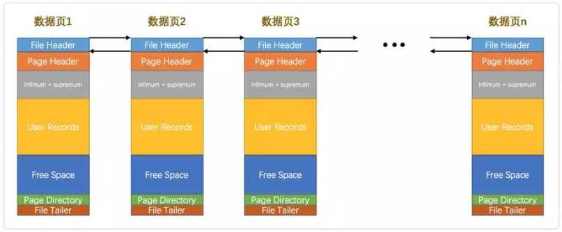 16KB,所以可能需要好多页来存放数据,FIL_PAGE_PREV和FIL_PAGE_NEXT就分别代表本页的上一个和下一个页的页号(双向链表)。