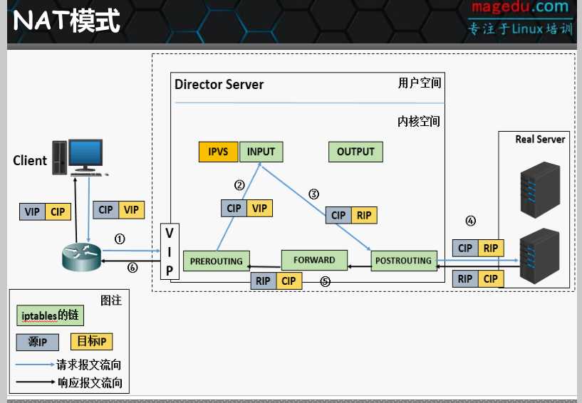 (2) RS收到的请求报文源地址是DIP,因此,只需响应给DIP;但Director还要将其发往Client