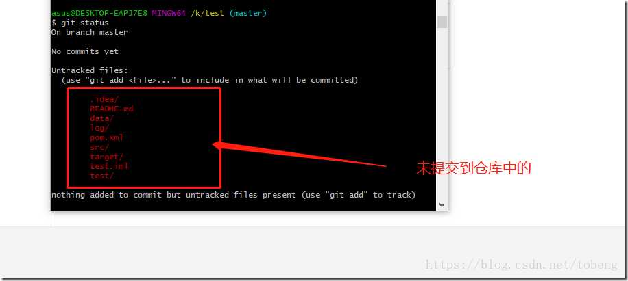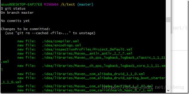 5、将工作区文件提交到缓存区中:输入:git status 查看有多少文件未提交到仓库中。