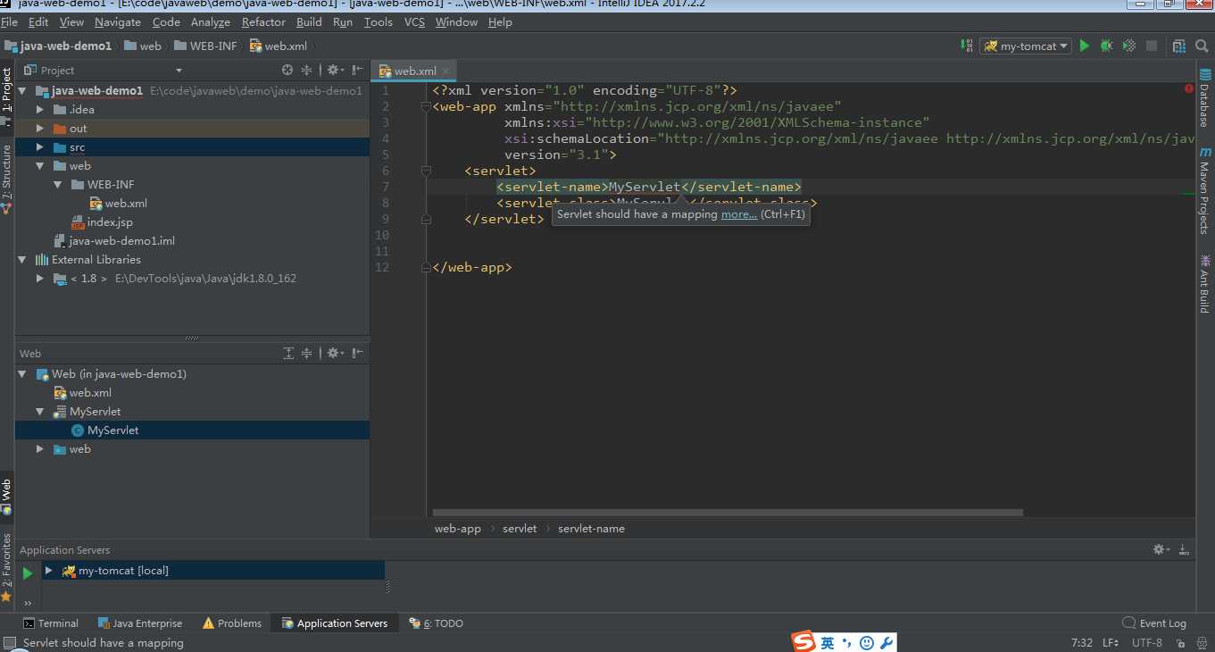 看到src源码包里面已经有了MyServlet类,