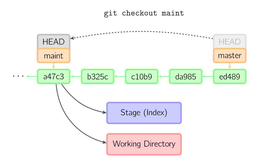 checkout命令用于从历史提交(或者暂存区域)中拷贝文件到工作目录,也可用于切换分支。当给定某个文件名时,git会从指定的提交中拷贝文件到暂存区域和工作目录。比如,git checkout HEAD~ foo.c会将提交节点HEAD~(即当前提交节点的父节点)中的foo.c复制到工作目录并且加到暂存区域中。(如果命令中没有指定提交节点,则会从暂存区域中拷贝内容。)注意当前分支不会发生变化。