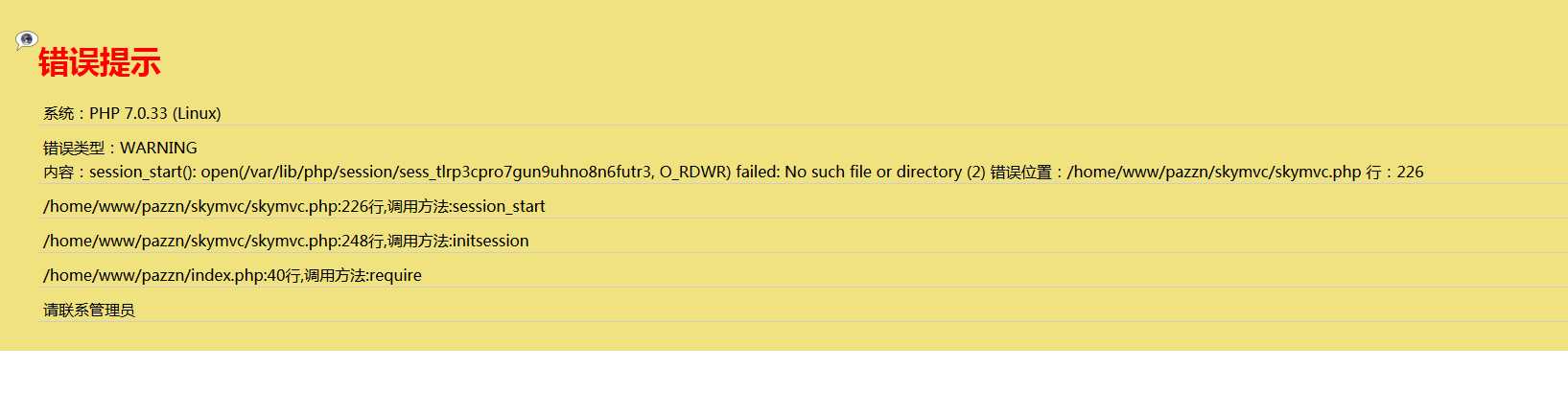 错误提示 系统:PHP 7.0.33 (Linux) 错误类型:WARNING 内容:session_start(): open(/var/lib/php/session/sess_tlrp3cpro7gun9uhno8n6futr3, O_RDWR) failed: No such file or directory (2) 错误位置:/home/www/pazzn/skymvc/skymvc.php 行:226 /home/www/pazzn/skymvc/skymvc.php:226行,调用方法:session_start /home/www/pazzn/skymvc/skymvc.php:248行,调用方法:initsession /home/www/pazzn/index.php:40行,调用方法:require 请联系管理员