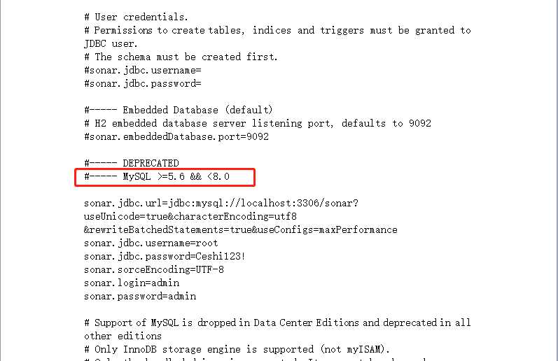 a. 本地安装MySQL,版本在5.6至8.0之间,第一个坑就是mysql版本安装高了,所以千万要确定好版本,在\sonarqube-7.7\conf\sonar.properties文件中可以搜索mysql查看支持的版本