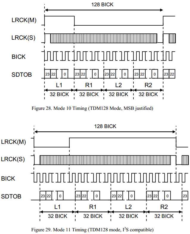 如果我们的C6748配置的TDM格式是延时一位的,也就是相对于帧时钟延时一个位时钟之后才传输数据,而我们的ADC配置的模式Figure28的模式,也就是数据相对于帧时钟没有延时,那么这个时候同样也是能够采集到音频数据的,只不过这时候采集的音频数据相对于真实数据最高位错了,这样导致的后果就是音量比实际音量大或小.
