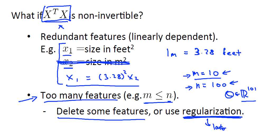 - 存在线性相关的特征。例如x1用平方英尺表示房屋面积,而x2用平方米表示面积,那么x1与x2是线性相关的。解决方法是删除某一个线性相关的某一特征。