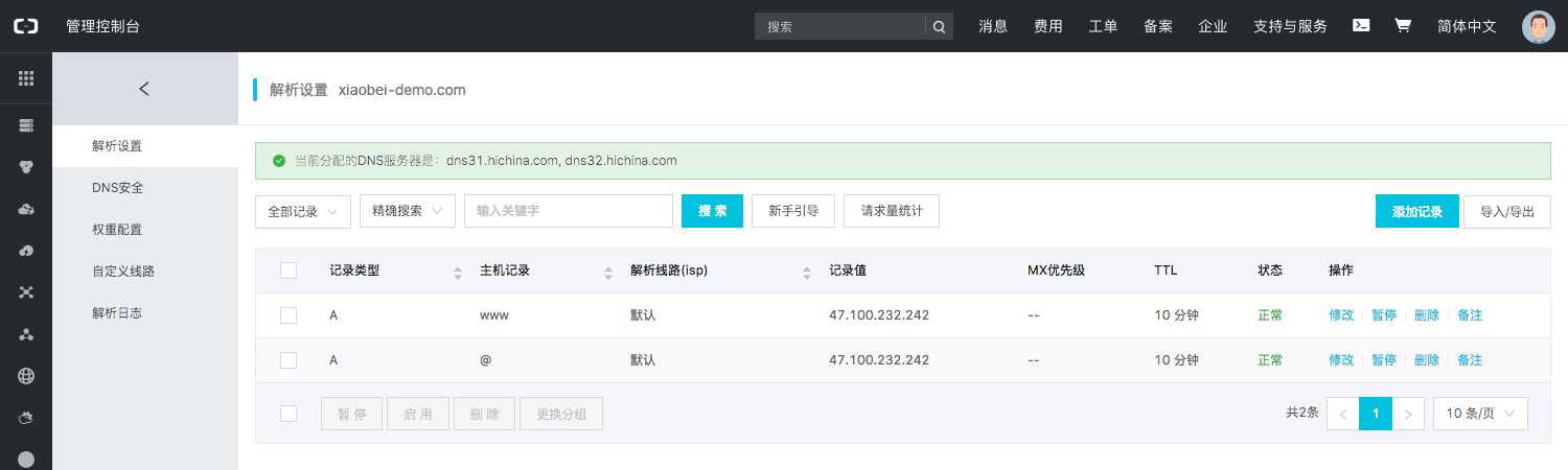在上面的例子中,我的域名是xiaobei-demo.com,添加这2条记录的意思是:当有人访问 http://xiaobei-demo.com 或 http://www.xiaobei-demo.com 时,会自动对应到 47.100.232.242 服务器上的 WordPress 网站。
