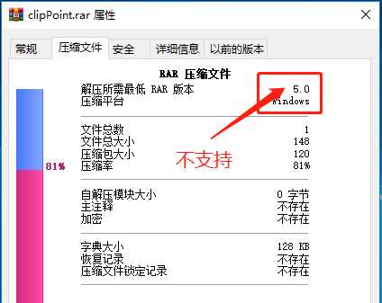 支持v4及以下版本压缩文件,不支持v5及以上。