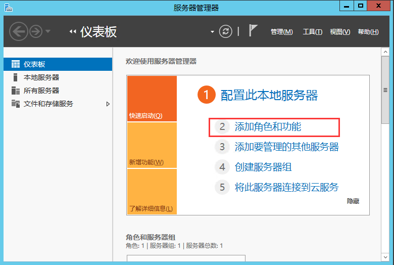 在弹出的服务器管理器窗口,单击右侧 添加角色和功能