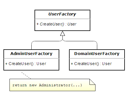 public static class UserFactory { public User CreateAdministrator(string name, int id) { // 略 } public User CreateDomainUser(string name, int id) { // 略 } }
