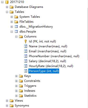 注意:查看生成的表结构,会发现生成的表中多了一个Discriminator字段,它是用来找到记录的实际类型,即从Person表中找到Employee或者Vendor。