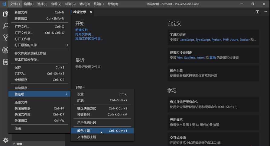文件 -> 首选项 -> 颜色主题 -> 上下按键 切换预览 -> enter选择
