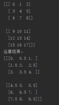 import numpy as np nd=np.arange(18).reshape((2,3,3)) print(nd) nd=nd/2 print("运算结果:") print(nd)