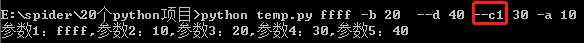 输入python temp.py ffff -b 20 --d 40 --c1 30 -a 10,将 - c换成 --c1,运行成功