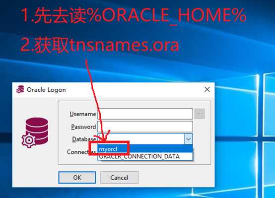 去读ORACLE_HOME,除了要得到oracle客户端的支持,同时还要读取ORACLE_HOME下面network/admin/tnsnames.ora文件来获取服务名。