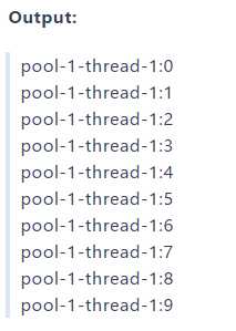 1 public static void main(String[] args) { 2 // 永远是一条线程 3 ExecutorService singleThreadPool = Executors.newSingleThreadExecutor(); 4 for (int i = 0; i < 10; i++) { 5 final int j = i; 6 singleThreadPool.execute(new Runnable() { 7 @Override 8 public void run() { 9 System.out.println(Thread.currentThread().getName() + ":" + j); 10 } 11 }); 12 } 13 singleThreadPool.shutdown(); 14 15 }