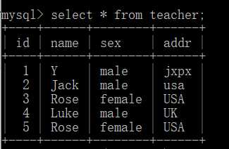 插入数据:insert into teacher(name,sex,addr) values(‘Y‘,‘male‘,‘jxpx‘);