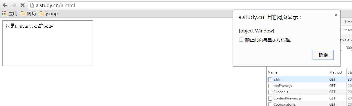 1 <!DOCTYPE html> 2 <html> 3 <head> 4 <meta charset="UTF-8"> 5 <title>Insert title here</title> 6 <script type="text/javascript"> 7 document.domain = ‘study.cn‘; 8 function test() { 9 alert(document.getElementById(‘a‘).contentWindow); 10 } 11 </script> 12 </head> 13 <body> 14 <iframe id=‘a‘ src=‘http://b.study.cn/b.html‘ οnlοad=‘test()‘> 15 </body> 16 </html>