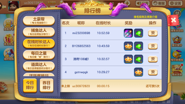 每日“被点赞”次数和总和(所有排行榜总和),只有上榜玩家可被点赞,每个排行榜(除活跃度排行榜以外)最多可点赞[1]5次。