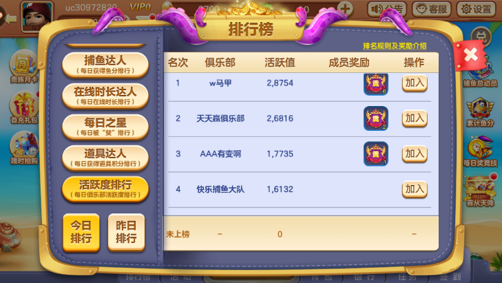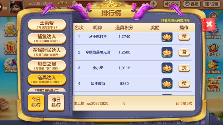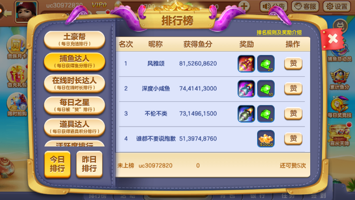 每日击杀鱼所获得鱼分总和(只计算获得,不计算消耗)