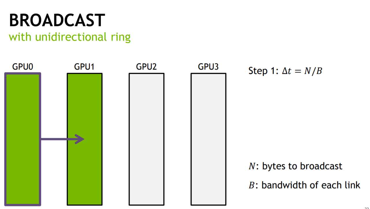 其中nccl采用一种Undirectional-Ring的单向环算法,可以实现同步时间与卡的个数无关,以BroadCast为例: