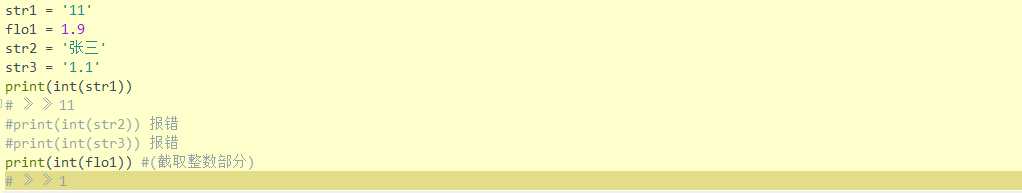 将其它类型转化成整数型 注意:int函数不能将文字型字符串和浮点数字符串转换成整数型,只能将符合整数规范的字符串转换成整数。