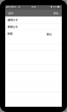 - 密码管理功能:点击添加按钮可弹出输入框并可创建新的密码口令(如图10),在密码别名上左划可删除已有密码(如图11),长按密码别名可设置默认密码(如图12):
