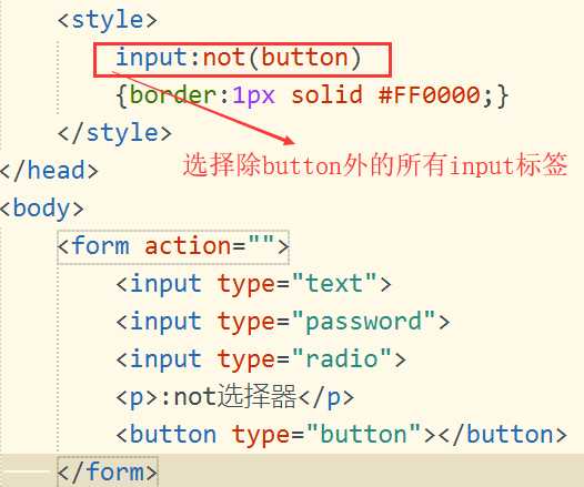 示例二:如form元素,想给表单中除submit按钮之外的input元素添加红色边框,CSS代码可以写成: