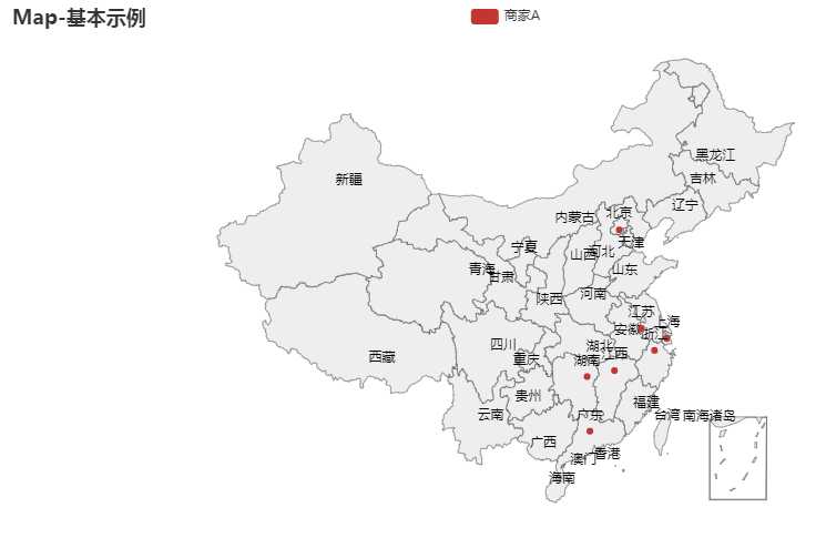 1 from example.commons import Faker 2 from pyecharts import options as opts 3 from pyecharts.charts import Map 4 5 map=( 6 Map() 7 .add("商家A", [list(z) for z in zip(Faker.provinces, Faker.values())], "china") 8 .set_global_opts(title_opts=opts.TitleOpts(title="Map-基本示例")) 9 ) 10 11 map.render()