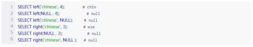 返回从字符串str最右边的len个字符,如果任一参数为null则返回null