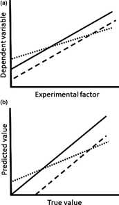 图3 随机取样会导致预测值偏离真实值,真实关系为实线。图(a)是预测模型,也称响应面,可以是更为复杂的关系;图(b)是预测评价模型,是线性关系