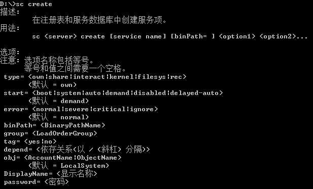 sc [ServerName] create [ServiceName] [type= {own|share|kernel|filesys|rec|adapt|interact type= {own|share}}] [start= {boot|system|auto|demand|disabled}] [error= {normal|severe|critical|ignore}] [binpath= BinaryPathName] [group= LoadOrderGroup] [tag= {yes|no}] [depend= dependencies] [obj= {AccountName|ObjectName}] [displayname= DisplayName] [password= Password]dos命令大全