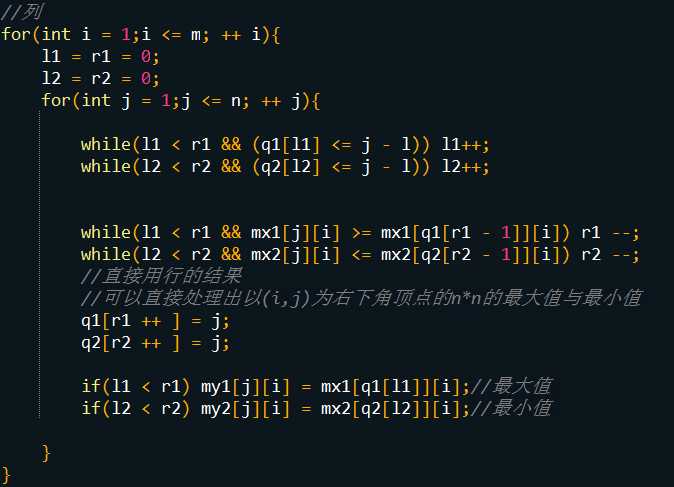 1 /*********************** 2 User:Mandy.H.Y 3 Language:c++ 4 Problem:luogu 2216 5 Algorithm: 6 Date:2019.9.4 7 ***********************/ 8 9 #include<bits/stdc++.h> 10 11 using namespace std; 12 13 const int maxn = 1005; 14 15 int n,m,l; 16 int a[maxn][maxn]; 17 int l1,r1,l2,r2; 18 int q1[maxn],q2[maxn]; 19 int mx1[maxn][maxn],mx2[maxn][maxn]; 20 int my1[maxn][maxn],my2[maxn][maxn]; 21 22 template<class T>inline void read(T &x){ 23 x = 0;bool flag = 0;char ch = getchar(); 24 while(!isdigit(ch)) flag |= ch == ‘-‘,ch = getchar(); 25 while(isdigit(ch)) x = (x << 1) + (x <<3) + (ch ^ 48),ch = getchar(); 26 if(flag) x = -x; 27 } 28 29 template<class T>void putch(const T x){ 30 if(x > 9) putch(x / 10); 31 putchar(x % 10 | 48); 32 } 33 34 template<class T>void put(const T x){ 35 if(x < 0) putchar(‘-‘),putch(-x); 36 else putch(x); 37 } 38 39 void file(){ 40 freopen("2216.in","r",stdin); 41 // freopen("2216.out","w",stdout); 42 } 43 44 void readdata(){ 45 read(n);read(m);read(l); 46 for(int i = 1; i <= n; ++ i) 47 for(int j = 1;j <= m; ++ j) 48 read(a[i][j]); 49 } 50 51 void work(){ 52 //行 53 for(int i = 1;i <= n; ++ i){ 54 l1 = r1 = 0; 55 l2 = r2 = 0; 56 for(int j = 1;j <= m; ++ j){ 57 58 while(l1 < r1 && (q1[l1] <= j - l)) l1++; 59 while(l2 < r2 && (q2[l2] <= j - l)) l2++; 60 61 while(l1 < r1 && a[i][j] >= a[i][q1[r1 - 1]]) r1 --; 62 while(l2 < r2 && a[i][j] <= a[i][q2[r2 - 1]]) r2 --; 63 64 q1[r1 ++ ] = j; 65 q2[r2 ++ ] = j; 66 67 if(l1 < r1) mx1[i][j] = a[i][q1[l1]];//第i行j-l+1~j的最大值 68 if(l2 < r2) mx2[i][j] = a[i][q2[l2]];//第i行j-l+1~j的最小值 69 //这个放在队列更新后,因为包括自身 70 //注意要存值而不是编号 71 //处理列的时候可以用到 72 } 73 } 74 //列 75 for(int i = 1;i <= m; ++ i){ 76 l1 = r1 = 0; 77 l2 = r2 = 0; 78 for(int j = 1;j <= n; ++ j){ 79 80 while(l1 < r1 && (q1[l1] <= j - l)) l1++; 81 while(l2 < r2 && (q2[l2] <= j - l)) l2++; 82 83 84 while(l1 < r1 && mx1[j][i] >= mx1[q1[r1 - 1]][i]) r1 --; 85 while(l2 < r2 && mx2[j][i] <= mx2[q2[r2 - 1]][i]) r2 --; 86 //直接用行的结果 87 //可以直接处理出以(i,j)为右下角顶点的n*n的最大值与最小值 88 q1[r1 ++ ] = j; 89 q2[r2 ++ ] = j; 90 91 if(l1 < r1) my1[j][i] = mx1[q1[l1]][i];//最大值 92 if(l2 < r2) my2[j][i] = mx2[q2[l2]][i];//最小值 93 94 } 95 } 96 int ans = 2e9; 97 for(int i = l;i <= n; ++ i) 98 for(int j = l;j <= m; ++ j){ 99 ans = min(ans,my1[i][j] - my2[i][j]); 100 } 101 put(ans); 102 } 103 104 int main(){ 105 // file(); 106 readdata(); 107 work(); 108 return 0; 109 }