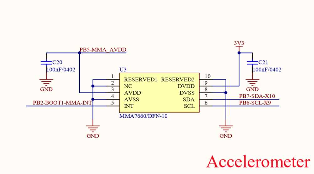 加速度传感器MMA7660连接到MCU的I2C1上,传感器的中断输出连接PB2,传感器的模拟电源通过 PB5 提供(这是因为传感器的功耗很低,需要的电流很小)。这样就可以通过PB5控制传感器是否工作了。