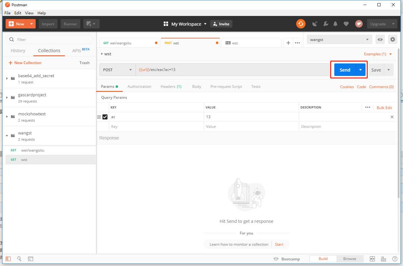 13.在当前collection下新建一个请求,请求方法、参数、url自定义,url要以{{url}}/xxx/xxx格式。header中配置x-api-key和{{name}}