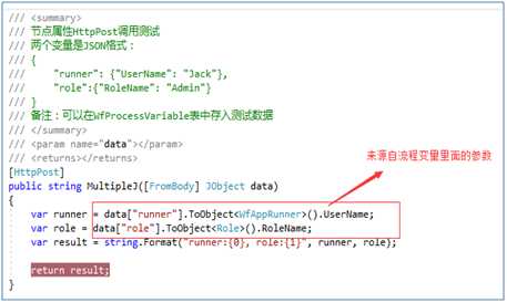 通过WorkflowService接口写入流程变量(WfProcessVariable),变量用来传递WebApi方法的参数,此处作为示例: