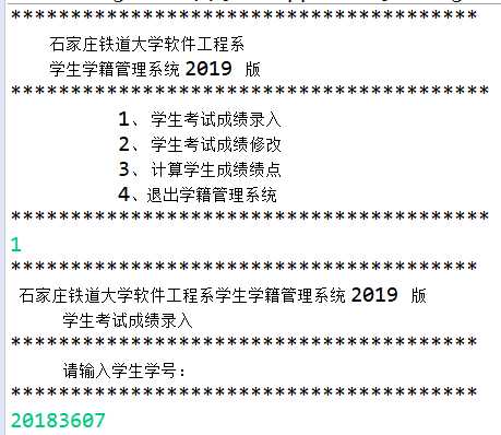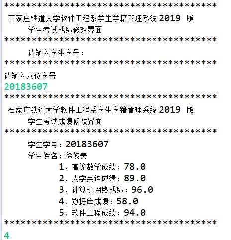 package StudentScore; public class ScoreInformation { String stunumber; //学号 String name; //姓名 double mathematicsscore; //高数成绩 double englishiscore; //英语成绩 double networkscore; //计算机网络成绩 double databasescore; //数据库成绩 double softwarescore; //软件工程成绩 //构造函数 public ScoreInformation(String stu,String n,double math,double eng,double net,double data,double sofe) { this.stunumber=stu; this.name=n; this.mathematicsscore=math; this.englishiscore=eng; this.databasescore=net; this.softwarescore=sofe; } String getstunumber() { return stunumber; } void setstunumber(String a) { stunumber=a; } String getname() { return name; } void setname(String a) { name=a; } double getmathematicsscore() { return mathematicsscore; } void setmathematicsscore(double a) { mathematicsscore=a; } double getenglishiscore() { return englishiscore; } void setenglishiscore(double a) { englishiscore=a; } double getnetworkscore() { return networkscore; } void setnetworkscore(double a) { networkscore=a; } double getdatabasescore() { return databasescore; } void setdatabasescore(double a) { databasescore=a; } double getsoftwarescore() { return softwarescore; } void setsoftwarescore(double a) { softwarescore=a; } } package StudentScore; import java.util.Scanner; public class ScoreManagement { //利用数组实现存储五个学生的信息 static ScoreInformation[] ss= {new ScoreInformation("20183607","徐姣美",0,0,0,0,0),new ScoreInformation("20180001","yi",0,0,0,0,0),new ScoreInformation("20180002","er",0,0,0,0,0),new ScoreInformation("20180003","san",0,0,0,0,0),new ScoreInformation("20180004","si",0,0,0,0,0)}; static Scanner stud=new Scanner(System.in); public static void main(String[] args) { menu();//显示目录 } //菜单目录 static void menu() { System.out.println("***************************************"); System.out.println(" 石家庄铁道大学软件工程系"); System.out.println(" 学生学籍管理系统 2019 版"); System.out.println("****************************************"); System.out.println(" 1、 学生考试成绩录入"); System.out.println(" 2、 学生考试成绩修改"); System.out.println(" 3、 计算学生成绩绩点"); System.out.println(" 4、退出学籍管理系统"); System.out.println("****************************************"); Scanner stud=new Scanner(System.in); int a=stud.nextInt(); switch(a) { case 1:add();break; //录入 case 2:xiugai();break; //修改 case 3:jidian();break; //计算绩点 case 4:exit();break; //退出 default:System.out.println("输入错误");menu(); //输入有误 } } //录入成绩 static void add() { System.out.println("***************************************"); System.out.println(" 石家庄铁道大学软件工程系学生学籍管理系统 2019 版 "); System.out.println(" 学生考试成绩录入 "); System.out.println("***************************************"); System.out.println(" 请输入学生学号: "); System.out.println("***************************************"); Scanner stud=new Scanner(System.in); String str=stud.nextLine(); int flag=0; for(int i=0;i<5;i++) { if(str.equals(ss[i].getstunumber())) { flag=1; //如果存在这个学号,flag置为1 System.out.println("***************************************"); System.out.println(" 石家庄铁道大学软件工程系学生学籍管理系统 2019 版"); System.out.println(" 学生考试成绩录入 "); System.out.println("***************************************"); System.out.println(" 学生学号:"+str); System.out.println(" 学生姓名:"+ss[i].getname()); System.out.println(" 请输入高等数学成绩:"); System.out.println("***************************************"); double sc1=stud.nextDouble(); System.out.println("***************************************"); System.out.println(" 石家庄铁道大学软件工程系学生学籍管理系统 2019 版 "); System.out.println(" 学生考试成绩录入"); System.out.println("***************************************"); System.out.println(" 学生学号:"+str); System.out.println(" 学生姓名:"+ss[i].getname()); System.out.println(" 高等数学成绩:"+sc1); System.out.println(" 请输入大学英语成绩:"); System.out.println("***************************************"); double sc2 =stud.nextDouble(); System.out.println("***************************************"); System.out.println(" 石家庄铁道大学软件工程系学生学籍管理系统 2019 版 "); System.out.println(" 学生考试成绩录入"); System.out.println("***************************************"); System.out.println(" 学生学号:"+str); System.out.println(" 学生姓名:"+ss[i].getname()); System.out.println(" 高等数学成绩:"+sc1); System.out.println(" 大学英语成绩:"+sc2); System.out.println(" 请输入计算机网络成绩:"); System.out.println("***************************************"); double sc3=stud.nextDouble(); System.out.println("***************************************"); System.out.println(" 石家庄铁道大学软件工程系学生学籍管理系统 2019 版 "); System.out.println(" 学生考试成绩录入 "); System.out.println("***************************************"); System.out.println(" 学生学号:"+str); System.out.println(" 学生姓名:"+ss[i].getname()); System.out.println(" 高等数学成绩:"+sc1); System.out.println(" 大学英语成绩:"+sc2); System.out.println(" 计算机网络成绩:"+sc3); System.out.println(" 请输入数据库成绩:"); System.out.println("***************************************"); double sc4=stud.nextDouble(); System.out.println("***************************************"); System.out.println(" 石家庄铁道大学软件工程系学生学籍管理系统 2019 版"); System.out.println(" 学生考试成绩录入 "); System.out.println("***************************************"); System.out.println(" 学生学号:"+str); System.out.println(" 学生姓名:"+ss[i].getname()); System.out.println(" 高等数学成绩:"+sc1); System.out.println(" 大学英语成