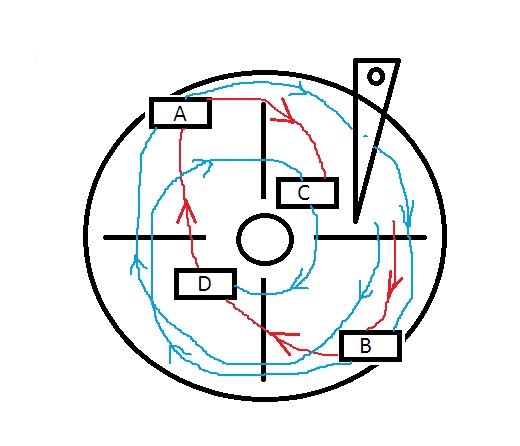 In the picture I tried to show what the elevator principle is. The computer asked the hard drive to read (or write) A, B, C and D blocks on the disk. Without any Command Queueing feature, the hard drive would take two and a half rotations of the disk to read all requested data (blue line). With Command Queuing, the hard drive will reorder the commands to B, D, A and C, taking only one rotation to read all requested data (red line).