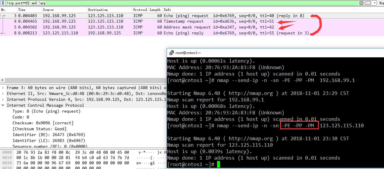 如果没有给出主机发现选项,nmap发送ICMP echo request请求,443端口TCP SYN数据包,80端口TCP ACK数据包和一个ICMP timestamp request。相当于默认值-PE -PS443 -PA80 -PP