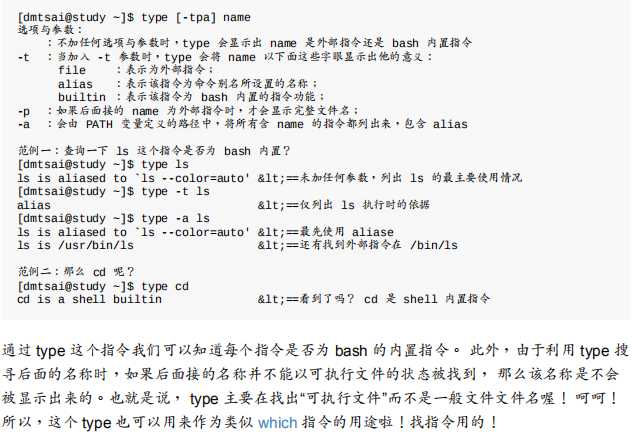 当我需要知道使用的指令来自哪里(非bash提供的与bash提供的)时,就可以使用type指令查看。