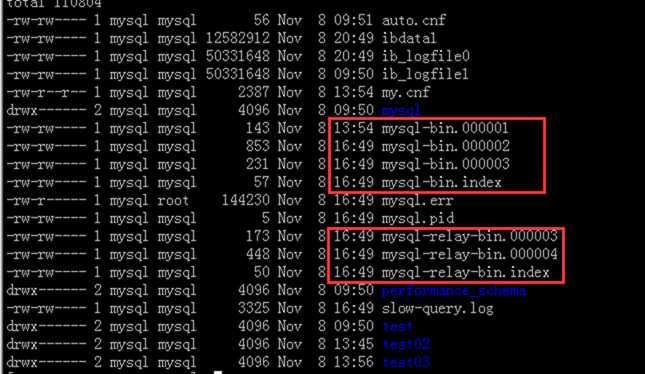 从正常主主同步时的二进制日志文件显示,有2套二进制日志。因此推断上面2个参数导致不能产生2套二进制文件,故导致二进制文件错乱和丢失。