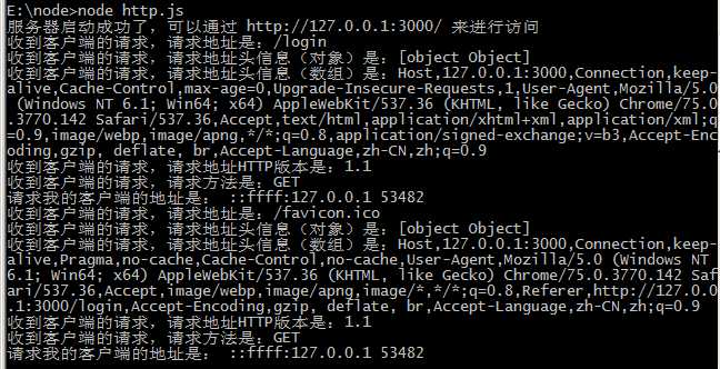 // 1. 加载 http 核心模块 var http = require(‘http‘); // 2. 使用 http.createServer() 方法创建一个 Web 服务器 // 返回一个 Server 实例 var server = http.createServer(); // 3. 注册 request 请求事件 // 当客户端请求过来,就会自动触发服务器的 request 请求事件,然后执行第二个参数:回调处理函数 server.on(‘request‘, function (req,res) { console.log(‘收到客户端的请求,请求地址是:‘+req.url); console.log(‘收到客户端的请求,请求地址头信息(对象)是:‘+req.headers); console.log(‘收到客户端的请求,请求地址头信息(数组)是:‘+req.rawHeaders); console.log(‘收到客户端的请求,请求地址HTTP版本是:‘+req.httpVersion); console.log(‘收到客户端的请求,请求方法是:‘+req.method); console.log(‘请求我的客户端的地址是:‘, req.socket.remoteAddress, req.socket.remotePort) //发送响应内容(res),res.setHeader()解决响应数据乱码 res.setHeader(‘Content-Type‘,‘text/html; charset=utf-8‘); //根据url不同响应不同数据 var url=req.url; if(url===‘/‘){ res.end("百度一下,你就知道,<a href=‘http://www.baidu.com‘>百度</a>"); }else if(url===‘/login‘){ res.end(‘this is login pages‘) }else if (url === ‘/products‘) { var products = [{ name: ‘苹果 X‘, price: 8888 }, { name: ‘菠萝 X‘, price: 5000 }, { name: ‘小辣椒 X‘, price: 1999 } ] //注:响应内容只能是二进制数据或者字符串 //所以对数字、对象、数组、布尔值等需进行转化。 res.end(JSON.stringify(products)) } else { //res.end()结束响应数据发送 res.end(‘404 Not Found.‘) } }) // 4. 绑定端口号,启动服务器 server.listen(3000, function () { console.log(‘服务器启动成功了,可以通过 http://127.0.0.1:3000/ 来进行访问‘); })