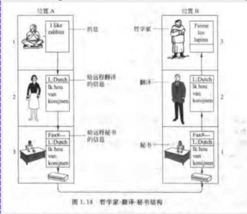 从概念上讲,第四层中对等的进程认为"它们之间的通信是水平的",他们使用了第四层的协议,但是这些过程实际上是与底下的层通过3/4之间的接口进行通信的,并不是与另一端进行通信