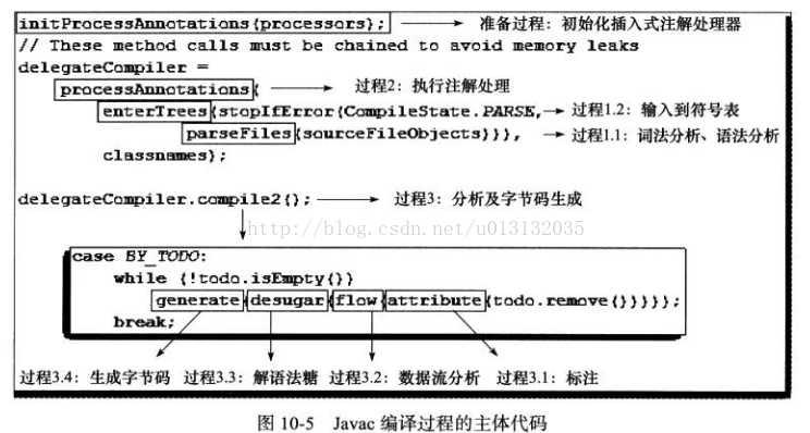 - 插入式注解处理器的初始化过程是在initPorcessAnnotations()方法中完成的,而它的执行过程则是在processAnnotations()方法中完成的。