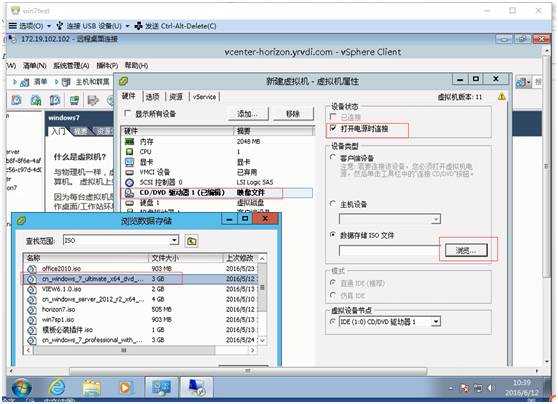 17、选择镜像文件,连接光驱:右击编辑虚拟机,选择光驱,选择数据存储浏览,选择需要的win7镜像文件,然后勾选打开电源是连接,点击确定打开虚拟机电源后即可开始安装OS。
