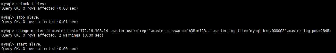 mysql> change master to master_host=‘172.16.103.14‘,master_user=‘repl‘,master_password=‘ADMin123,.‘,master_log_file=‘mysql-bin.000002‘,master_log_pos=2848;