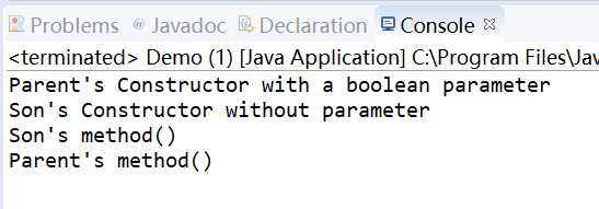 Parent‘s Constructor with a boolean parameter Son‘s Constructor without parameter Son‘s method() Parent‘s method()
