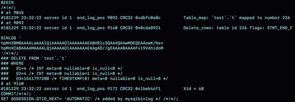 use ‘test’命令之后的 delete 语句,就是我们输入的 SQL 原文了。可以看到,binlog“忠实”地记录了 SQL 命令,甚至连注释也一并记录了。